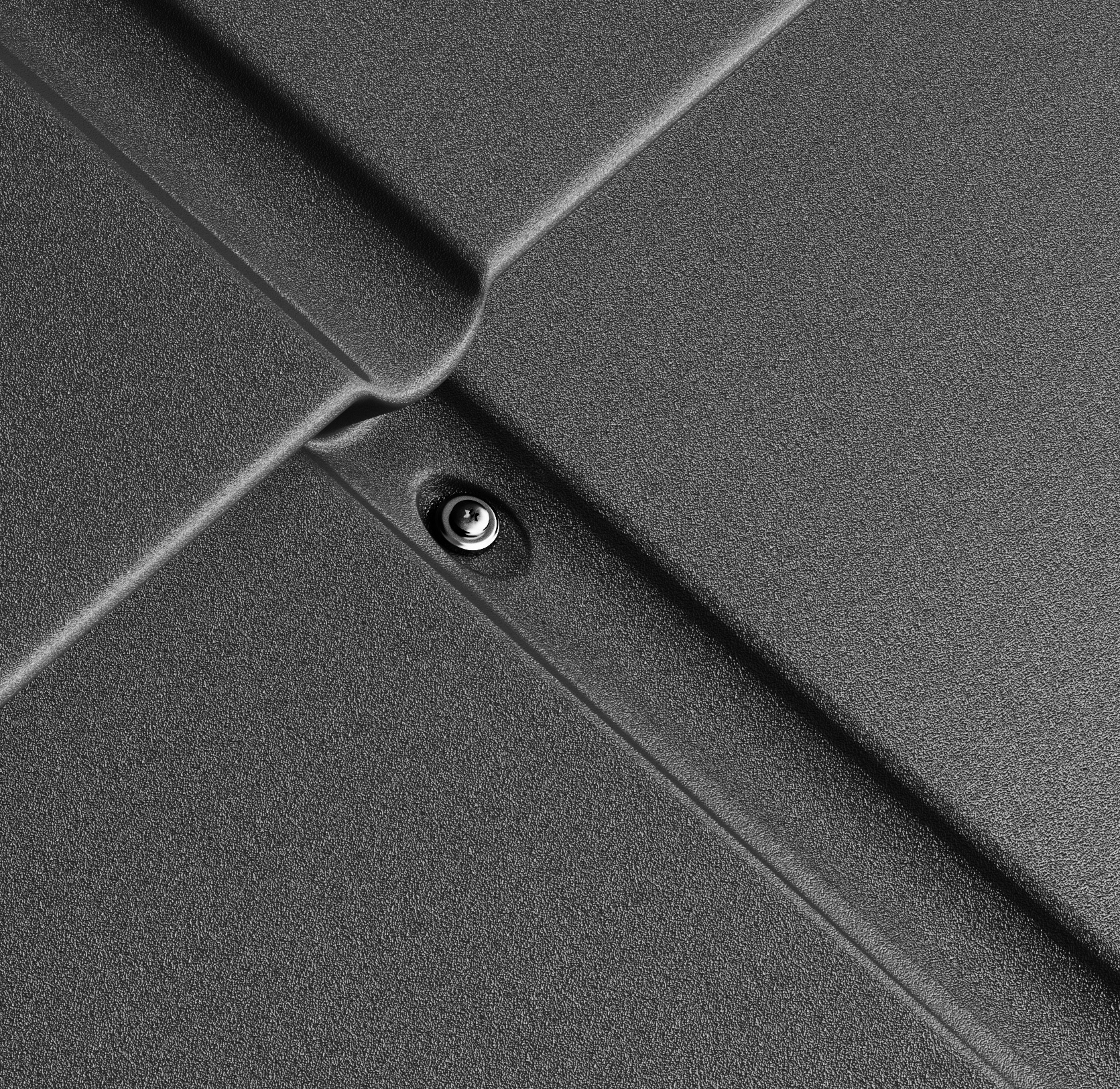 Autorskie rozwiązanie, dzięki któremu arkusze pasują do siebie jak nigdy wcześniej. W celu uniknięcia efektu wypychania nakładających się blach w miejscu łączenia trzech arkuszy, w dachówkach modułowych IZI zastosowano wycięcie rogu dolnego przetłoczenia. Dodatkowo specjalnie ukształtowany skrajny profil przetłoczeń umożliwia idealne spasowanie arkuszy, bez widocznych łączeń wzdłużnych.
